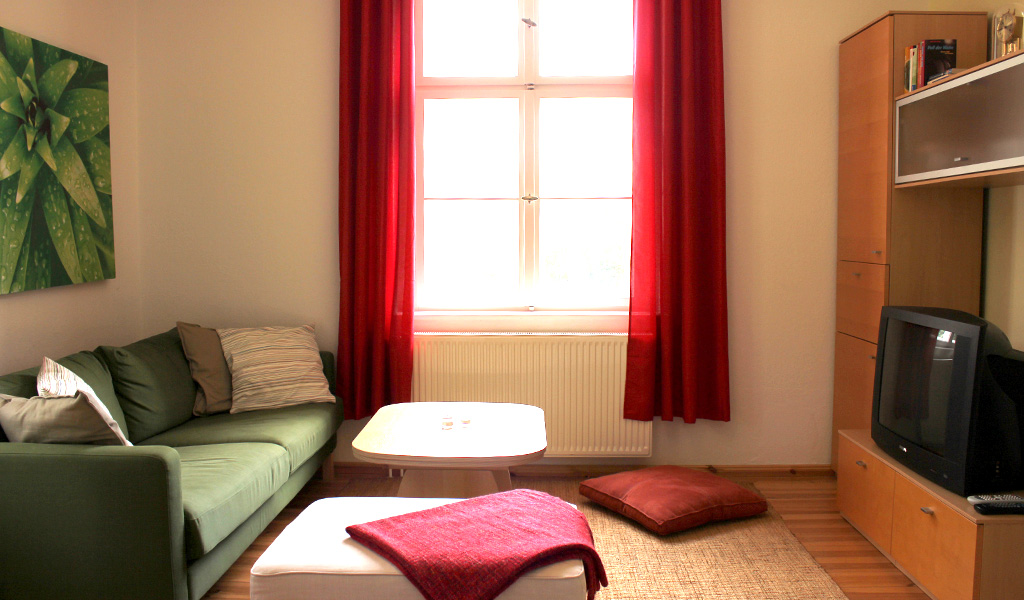 - Im Wohnzimmer stehen ein Sofa und eine Schrankwand mit Fernseher. Eine Spielesammlung ist vorhanden.