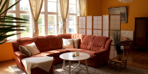 - Ein Paravent trennt das Doppelbett vom Wohnbereich – eine Wohnlandschaft und ein großer Esstisch laden ein.